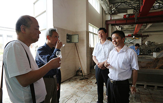 贾连朝一行首先来到一车间,一边观看工人们用传统酿造工艺酿酒制业的过程,一边听取国家级评酒专家、公司总工程师王永亮对酿造工艺以及产品特点的介绍。赵书民总经理为贾连朝斟上一杯新酿的原酒,贾连朝品尝后不住点头称赞。