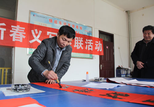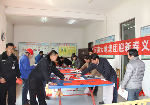 (本报讯)2月10日上午,农历甲午年腊月二十二,大地公司中控办公楼一楼烧成车间会议室内,翰墨飘香,欢声笑语,大地集团在这里隆重举行迎新春义写春联活动。 在传统乙未年农历新春佳节到来前夕,大地集团在妥善安排好职工年货的基础上,非常重视od(中国)官方网站建设,邀请部分国家级和省级书法家协会会员到集团开展义写春联活动,活跃od(中国)官方网站,营造新春气氛。此前,集团提前安排专人购买了笔墨纸砚和红纸,并结合企业发展现状,拟写了部分喜庆、新颖、励志、接地气的新春楹联内容,使职工在欢度新春佳节的同时,提振士气,爱岗敬业,立足岗位做贡献。