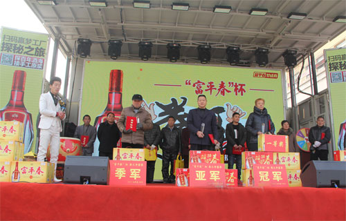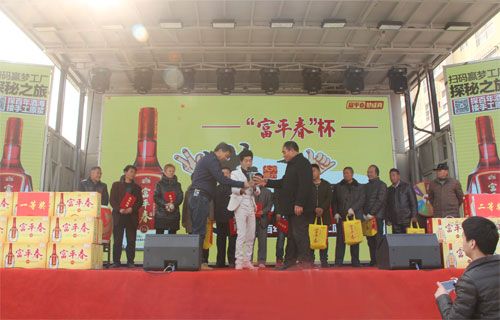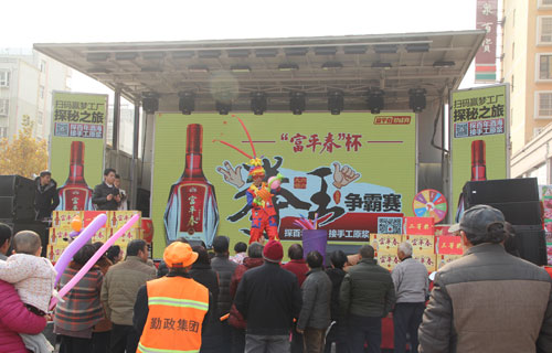 为传承酒令文化,感受当地民俗魅力,丰富百姓文化生活贾湖酒业集团在各个销售区域搭建“拳王争霸”赛事平台,比赛内容主要是以划拳比胜负。宝丰作为比赛的第一站,该活动得到广大人民群众的热烈响应,11月份开办以来,报名参赛人数达500多人,通过在石桥、大营、杨庄等乡镇的6场海选,最终选出15名选手进入总决赛。经过几轮紧张而激烈的角逐后,城关镇的陈伏最终荣获冠军;城关镇的林帅荣获亚军;商酒务镇的卢白孩荣获季军,并获得了贾湖酒业为他们准备的价值不菲的富平春酒。