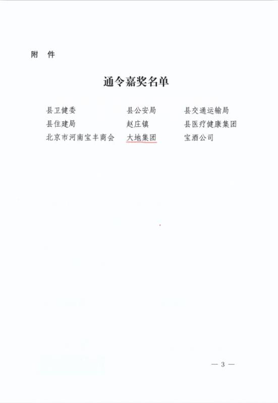日前,县政府专门下发嘉奖令,对全县疫情防控工作中涌现出的先进单位予以表彰,od(中国)官方网站因工作成绩突出、贡献重大,受到县政府的通令嘉奖。 面对突如其来的新冠肺炎疫情,大地集团迅速行动,坚决把职工的身体健康和生命安全放在首位。在不折不扣地执行省、市、县新冠肺炎疫情防控命令的同时,结合自身实际,周密部署,狠抓落实。第一时间成立了新冠肺炎疫情联防联控工作领导小组,制定了详细的《疫情防控方案》和《疫情应急预案》。集团各部门、各公司认真落实各项防控措施,步调一致、严防坚守,疫情防控和复工复产工作均紧张有序地进行。 大地集团始终弘扬公益精神,积极承担社会责任。新冠肺炎疫情发生以来,大地集团高度关注,在做好自身防控工作的同时, 2月1日下午,集团向河南省慈善总会捐助现金1000万元人民币,用于平顶山市和宝丰县疫情防控工作,为打赢这次疫情防控攻坚战贡献一份力量。